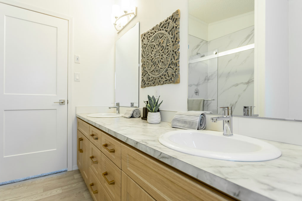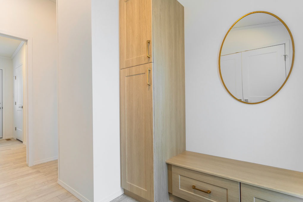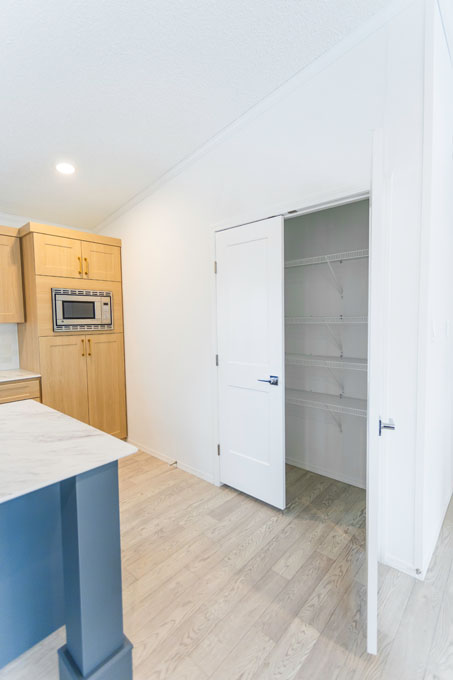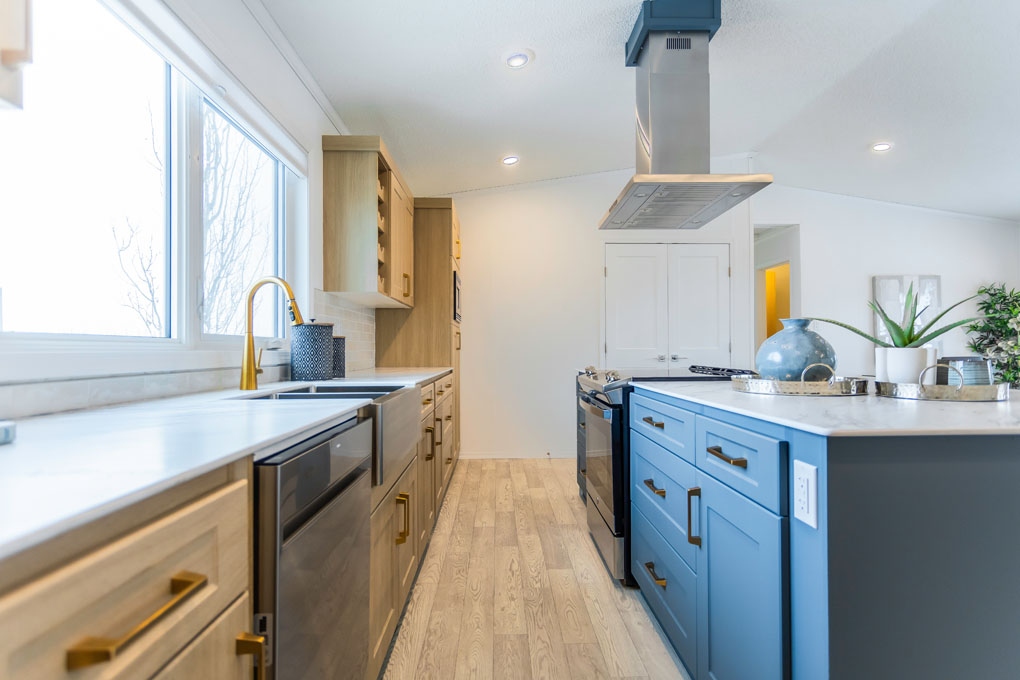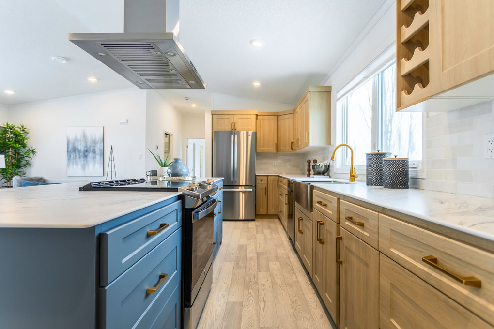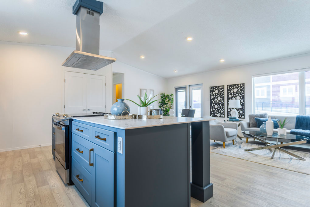 Welcome to the Oceanview, our stunning new show home is sure to captivate you from the moment you step inside. As you enter, you’ll be greeted by a spacious and inviting entrance with a built-in bench and front closet. The heart of the home, the kitchen, is a chef’s delight, boasting ample space and storage to fulfill all your culinary dreams. With warm natural wood tones and striking blue two-tone cabinets, the Oceanview exudes an airy, bright, and welcoming atmosphere that instantly feels like home.