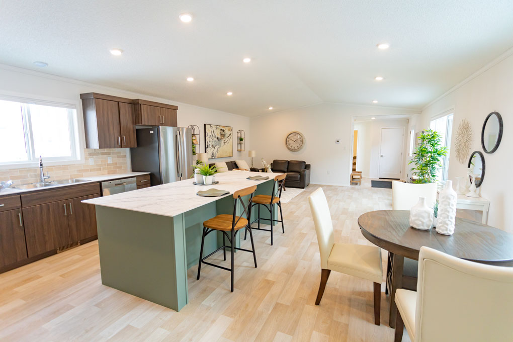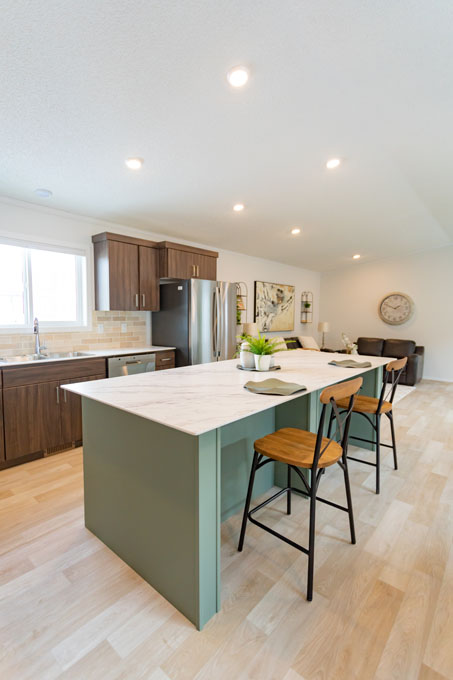 Introducing the revamped Sierra show home, where modern design meets practicality in a captivating 1,520 sq. ft. space. Offering 3 bedrooms and 2 bathrooms, this home is tailored for those seeking comfort and functionality. Step into the heart of the home – a spacious kitchen featuring trendy new colors, including a sage green island and wood-look two-tone cabinets. Perfect for culinary enthusiasts, the kitchen features a large island and corner pantry, offering ample storage and workspace for all your cooking needs.