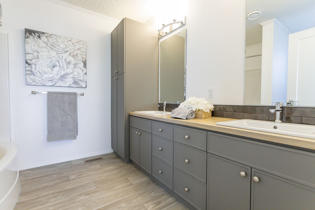 The primary bedroom is on the opposite side of the spare bedrooms for added privacy. The ensuite includes built-in linen storage for added convenience, while the generously sized spare bedrooms provide plenty of room to spread out. We’ve also added a counter over the washer and dryer to make laundry day more convenient. This extra workspace is perfect for folding clothes, organizing essentials, or even adding a decorative touch to your laundry area.